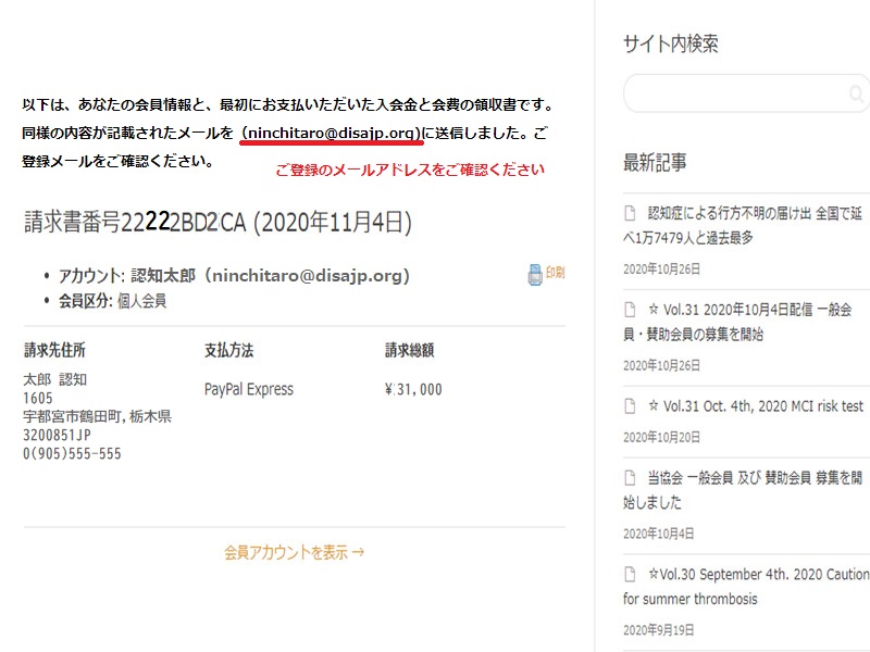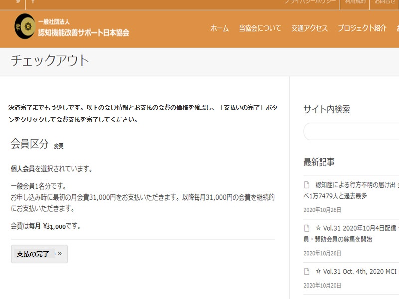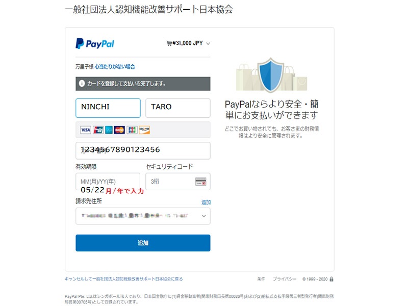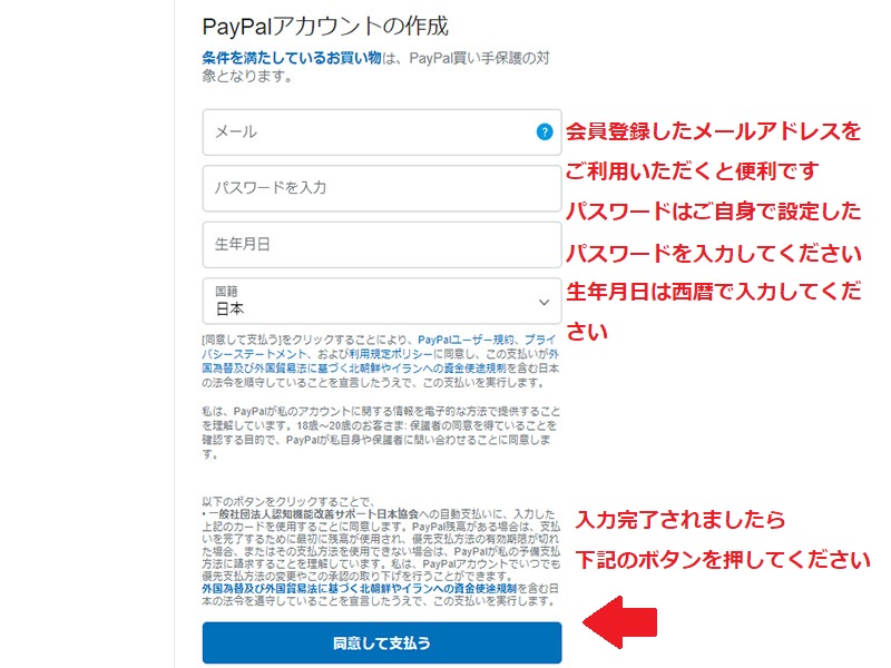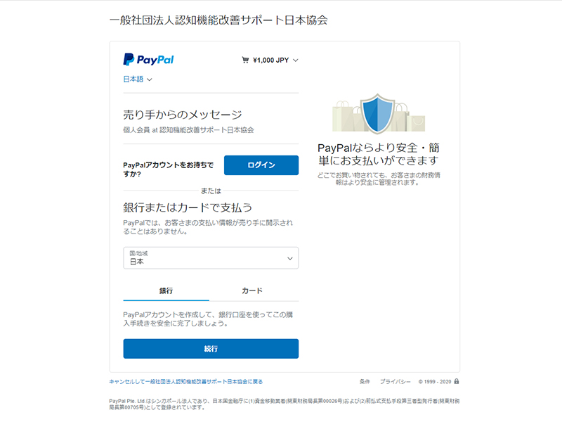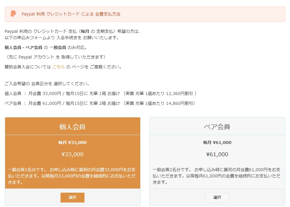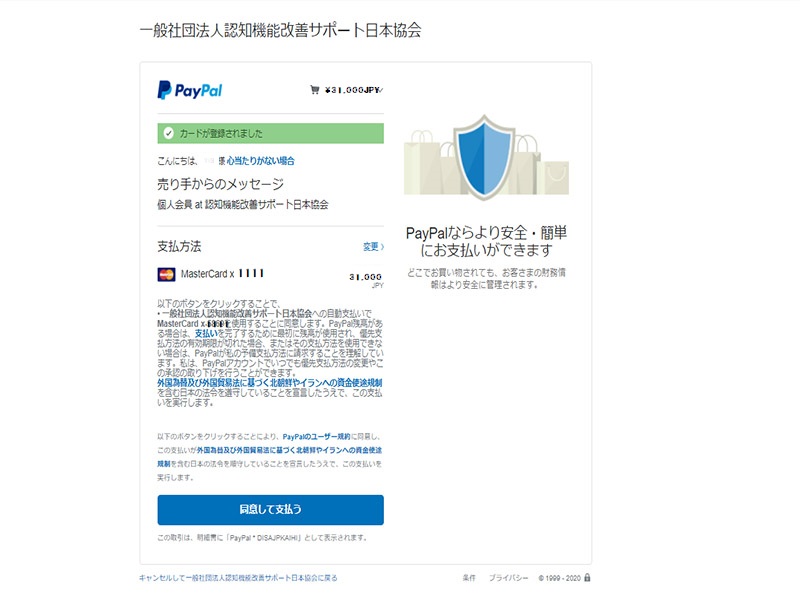 会費納入方法 Paypal決済利用クレジットカード払い についてご案内申し上げます。 クレジットカードによる会費の支払は 一般会員 (個人会員 ・ ペア会員) のみの 会費支払方法です。 賛助会員 の会費支払は 銀行口座振替 方法のみとなります。 Paypal決済利用のお支払方法について 入会申し込みページにて、ご希望の会員区分を選択してください 会員種別の確認ページ及び、アカウント情報の入力画面となります ユーザー名は英文字で、メールアドレスは送受信可能なメールを 会員情報として、ユーザー登録は英文字で、住所は海外対応のため、正しい住所を入力順序に注意して入力してください ※電話は、携帯(スマホ)の番号を入力ください(本人確認認証番号送付のため) ペイパル ページに リンクします。 銀行口座振替 または クレジットカード決済を選択してください(※ 推奨:クレジットカード決済 ・ 銀行口座支払は、入力情報が多くなります) メールアドレスがペイパルアカウントとなりますので、送受信可能なメールアドレスにてご登録ください。電話番号は携帯番号を入力してください(本人確認に利用するため)パスワードは、ペイパルログイン時に必要です。ご自身でパスワードを設定してください ペイパルアカウントをお持ちの方は「ログイン」して支払にお進みください。ペイパルアカウントをお持ちでない方は、銀行またはカード支払を選択し、各欄に入力してください ※電話番号は携帯(スマホ)の番号を入力ください(本人確認認証番号に使用します)番号の最初の「0」を抜いた番号を入力してください。お住まいの住所を入力してください。後日、ペイパルより本人確認暗証番号のハガキが郵送されます メールアドレスは、会員登録したメールアドレスと同じものをご利用いただくと便利です。パスワードは、ペイパルログインに必要です。ご自身でパスワードを設定してください。生年月日は西暦で入力してください アカウントの作成が完了するまで時間がかかります。この画面が表示されている間は、ウィンドウを閉じたり、他の作業をしないでください クレジットカード情報を入力してください。姓名は、カード記載のアルファベットで入力をお願いします。有効期限の数字の入力は「月/年」となりますので、ご注意ください。セキュリティコードは、カード裏面の3桁の番号となります。請求先住所は、先ほど入力した住所が自動入力されています。間違いないかご確認ください ペイパルの支払請求確認ページに移動します。売り手が「一般社団法人認知機能改善サポート日本協会」であることと、支払金額と、登録クレジットカード(下4桁のみ記載されます)に間違いがないことを確認して、「同意して支払う」を押してください 協会の公式サイトにリンクします。この画面の最下部の「支払の完了」ボタンを押してください。会員種別と会費の支払状況などが確認できる「マイページ」へ移動します 会員情報と支払のされた入会金・会費の金額が確認できます。同時に、ご登録のメールアドレス宛に、確認メールが届いていることをご確認ください 協会からの確認メールに加え、ペイパルからも支払確認のメールが届きます。以上のメールが届きますと、無事に会費の支払が完了します 今すぐ『光華』- KOUKA をお求めの方、入会前にお試しをされたい方は、24時間注文受付可能な 「DIS SHOP」 にて、光華購入できます。